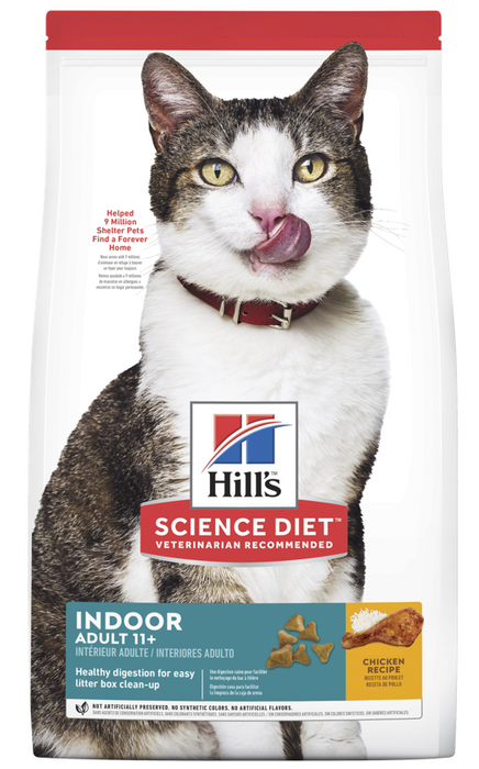 HILL'S SCIENCE DIETÂ INDOOR ADULT 11+ DRY CAT FOOD IS SPECIALLY FORMULATED TO FUEL THE ENERGY NEEDS OF CATS WITH AN INDOOR LIFESTYLE DURING THEIR GOLDEN YEARS.