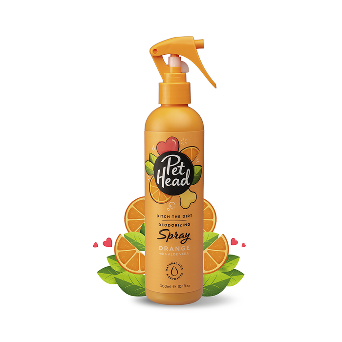 DEODORISING - Our powerful yet gentle dog deodorant spray neutralizes odours and gets your pooch smelling fresh on the go with this charcoal infused deodorizing spray. Our upscale Orange Sanguine fragrance is a refreshing and energetic fragrance of fresh fruits with an oriental base. It contains notes of red orange, bitter orange, jasmine, geranium from South Africa, amber, tonka bean and sandalwood.WITH NATURAL OIL & EXTRACTS - Our ditch the dirt, deodorizing spray contains Charcoal powder that works like a magnet to attract dirt and oils. Orange peel oil helps to eliminate the bad smells whilst rosemary leaf extract makes the coat stronger.DIRECTIONS - Spray onto fur, brush out and towel dry for a best smelling pooch. No rinse needed.HIGH QUALITY INGREDIENTS - all Pet Head products are pH balanced, contain aloe vera & vegetable protein and are packed with natural and wholesome ingredients. All our fragrances are exclusive to Pet Head and were designed and formulated with rare & upmarket ingredients leaving your pooch smelling amazingly fresh & fruity.SAFE - for you and your dog. All Pet Head products are free from all nasties - no parabens surfactants or dyes. Gluten & nut free for safety. We are transparent, all our ingredients are fully listed in our packaging. Pet Head is proudly vegan and is and will always be, cruelty free.