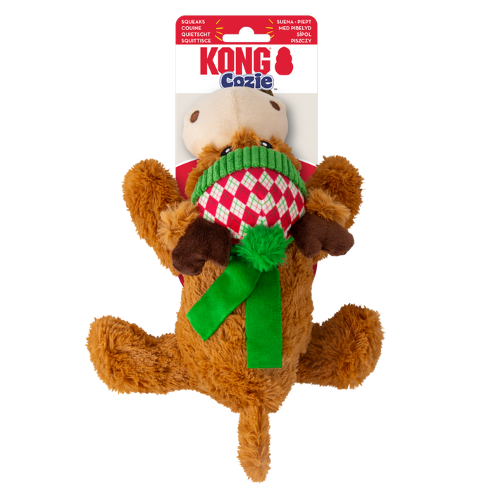 KONG® Holiday Cozie™ Reindeer is a soft and luxuriously cuddly plush toy perfect for seasonal snuggling. Made with an extra layer of material for added strength, this reindeer is an ideal toy for gentle chewing and indoor fun.