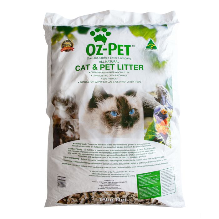OZ PET PELLETS ODOUR FREE LONG LASTING ODOUR CONTROL. ALL NATURAL, ECO-FRIENDLY, 100% BIODEGRADABLE, & NON-CLUMPING. HIGHLY ABSORBENT, QUICK ACTING, & LONG-LASTING. RECYCABLE, DISPOSE OF YOUR WASTE LITTER ON PLANTS (NOT VEGETABLES), FLOWERS OR THE LAWN. SUITABLE FOR ALL LITTER TRAYS BUT WILL LAST LONGER IF USED WITH THE OZ-PET 2-PIECE TRAY SYSTEM (CAT LOO). IDEAL LITTER OR BEDDING FOR CATS, KITTENS, BIRDS, REPTILES, MICE, RATS & GUINEA PIGS. PACK SIZE FOR HORSE BEDDING.