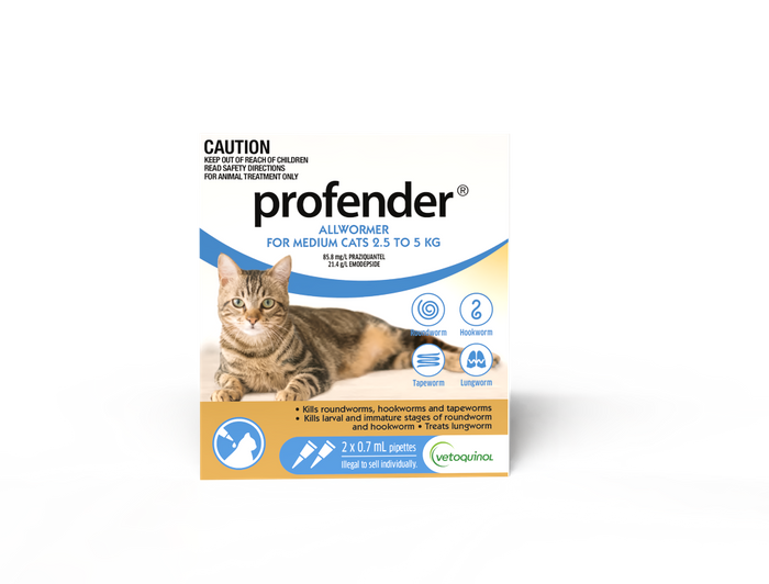 Profender® breaks the life cycle by killing larvae, immature adult and adult intestinal worms and lungworm before they have a chance to cause serious damage or spread. Tableting a cat can be difficult — Profender® eliminates this step by providing a pre-measured, spot-on applicator to make treating your cat a breeze. Simply apply Profender® to the skin at the back of your cat’s head to be sure they’re getting thea required dose. Use Profender® at the start of every season (or every three months) to keep nasty worms at bay. With a fuss-free application, you can’t go wrong with Profender® Cat Allwormer for Cats to keep your cat healthy and happy.
