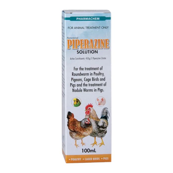 Pharmachem Piperazine Solution Is A Super Concentrated Formulation, Making It An Effective Control Of Roundworm In Poultry, Pigeons, Cage Birds And Pigs. It Is Also An Effective Nodule Wormer In Pigs.Pharmachem Piperazine Solution Is An Easy To Administer Liquid Preparation And If Used As Directed, Will Prove To Be An Economical Wormer Which Can Be Administered With Minimum Fuss. Simply Combine The Required Amount With Water And Then Leave The Rest Up To The Piperazine Citrate. This Preparation Can Also Be Administered In Wet Mash Or By Individual Drenching Where Pigs Are Concerned.
