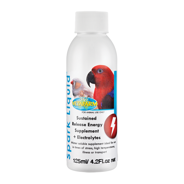 Vetafarm Spark Liquid Vetafarm Spark Liquid Is A Carbohydrate And Electrolyte Replacement Perfect For Use During Times Of Stress, High Temperatures, Illness Or Transport For Many Types Of Birds. Through Providing Energy And Electrolytes It Helps Hydrate And Support Your Birds While Also Increasing Vigour And Vitality In Birds On Show Or Displayed For Sale. Suitable For Use In Aviary Birds Drinking Water As A First Aid Measure For Sick, Stressed & Injured Birds. Simply Use 20Ml Of Vetafarm Spark Liquid To 1L Of Drinking Water.