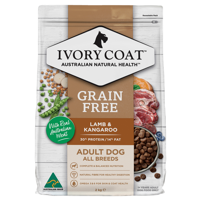 Ivory Coat Lamb & Kangaroo Grain Free Adult Dry Dog Food Is Full Of Flavoursome, High-Quality Ingredients That Combine To Deliver A Satisfying, Nutritious And Balanced Meal For Your Pet. With Two Kinds Of Meat, It Offers A Good Amount Of Protein To Keep Muscles In Shape. Natural Prebiotic Is Also Added To Enhance Digestive Function, Alongside Essential Vitamins And Minerals For Complete Nutrition. Its A Delicious Combination Of Vegetables, Fruits And Superfoods With No Artificial Colours Or Flavours For An All-Natural Source Of Nourishment Inside And Out. Kibble-Sized Yet Big On Taste And Health Benefits, The Lamb & Kangaroo Grain Free Dog Food Also Contains Omega-3 And Omega-6 Fatty Acids, Promoting Healthy Skin And Coat.