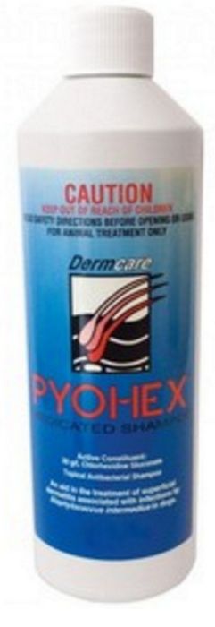 Dermcare Pyohex Shampoo Medicated, 1L Bacterial Skin Infections In Dogs Need Treatment And Pyohex Shampoo Is Specifically Formulated To Help. This Topical Medicated Shampoo Contains Chlorohexidine Gluconate As The Active Constituent. It Helps To Remove Dirt, Scaly Skin And Grease Whilst Killing Cutaneous Micro-Organisms That Often Cause Dermatitis. You Only Require 1Ml Of Shampoo For Every Kilogram Of Your Dogs Weight, Making This Product Long-Lasting.