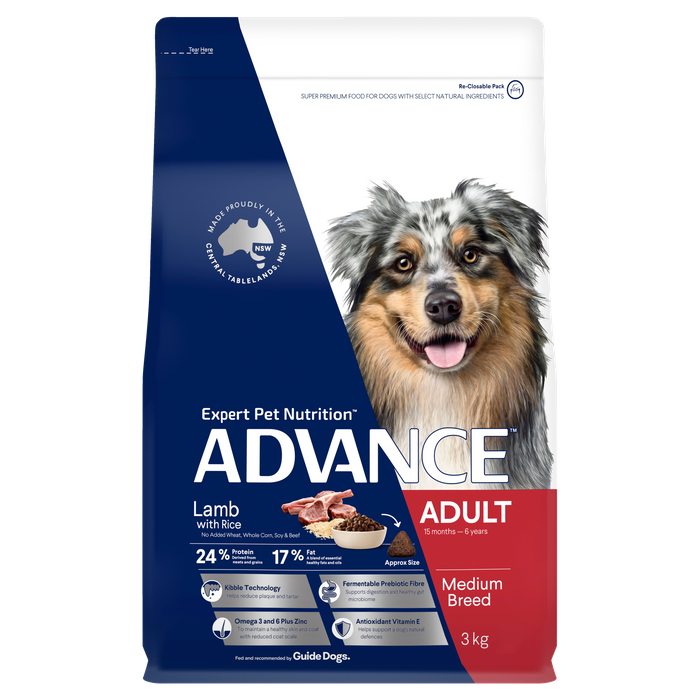 Advance Adult All Breed Dry Dog Food Lamb 3Kg Is A Super Premium Food For Dogs With Select Natural Ingredients. Supports Dental Health Through Mechanical Abrasion To Help Reduce Plaque And Tartar Accumulation. Also Contains Nutrients To Support Digestive Health Immune Health And A Healthy Skin And Shiny Coat Advance Is Scientifically Formulated To Help Improve Dog Health.