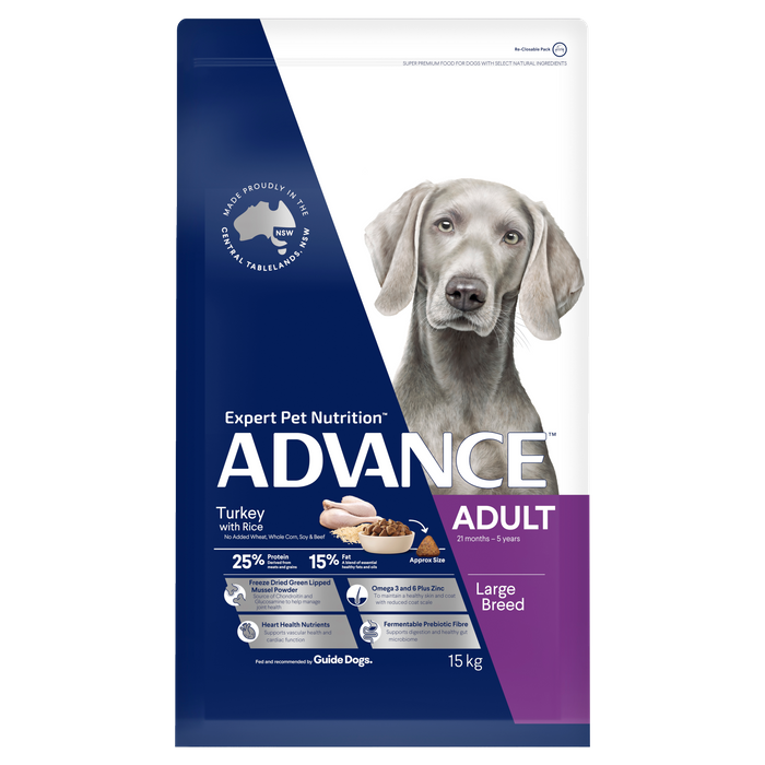 Advance Adult Large+ Breed Dry Dog Food Turkey 15Kg Is A Super Premium Food For Dogs With Select Natural Ingredients. Supports Dental Health Through Mechanical Abrasion To Help Reduce Plaque And Tartar Accumulation. Formulated To Support Vascular Health And Cardiac Function. Also Contains Nutrients To Support Immune Health Joint Health Digestive Health And A Healthy Skin And Shiny Coat Advance Is Scientifically Formulated To Help Improve Dog Health.
