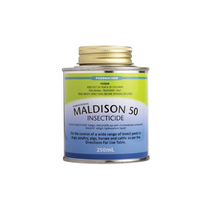 Insecticidal Concentrate For The Control Of Lice, Fleas, Brown Dog Tick, Sarcoptic Mange, Poultry Mites, Lice & Fowl Tick, Fly & Mosquito Control.For Use On Horses, Pigs, Cattle, Poultry, Dogs And Cats.Product Benefits:Pharmachem Maldison 50 Controls Flies In Areas Such As Dairies, Stables, Rubbish Dumps And Piggeries.Indications:Pharmachem Maldison 50 Is An Organo-Phosphorous Anti-Cholinesterase Compound That Attacks The Central Nervous System Of Parasites – I.E. Mosquitoes, Lice, Poultry Mites, Fowl Tick, Dog Fleas, Brown Dog Tick And Sarcoptic Mange.