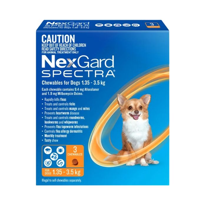 NEXGARD SPECTRA ORANGE IS SUITABLE FOR VERY SMALL DOGS FROM 1.35 - 3.5 KG IN BODYWEIGHT. WITH NEXGARD SPECTRA, YOUR DOG WILL RECEIVE THE MOST COMPLETE PROTECTION AGAINST FLEAS, TICKS, MITES, LICE, HEARTWORM AND INTESTINAL WORMS, ALL IN ONE TASTY CHEW. DID YOU KNOW THAT SOME PARASITES THAT AFFECT PETS CAN BE TRANSMITTED TO PEOPLE? USING NEXGARD SPECTRA ALIGNS WITH GUIDELINES FROM INFECTIOUS DISEASE EXPERTS WHO RECOMMEND MONTHLY DEWORMING OF ALL DOGS TO REDUCE THE RISK.*NOW REGISTERED FOR WEIGHT 1.35-3.5KG NEW PACKAGING COMING SOON