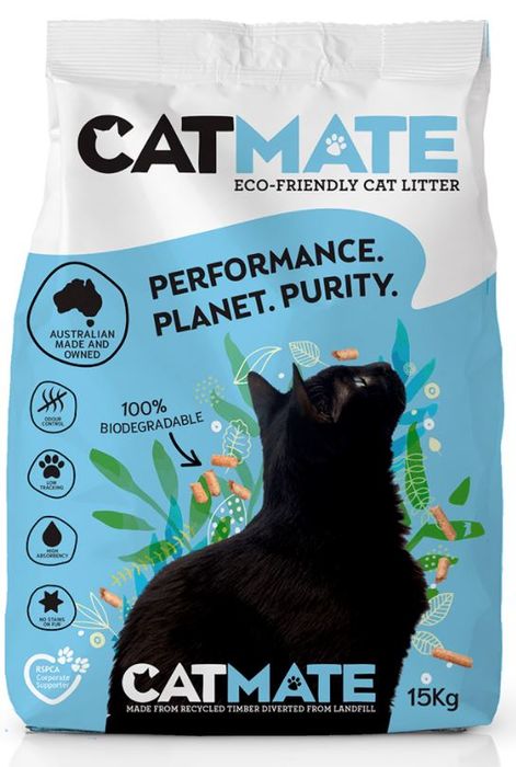 ECO-FRIENDLY, ODOUR CONTROLLING, WOOD LITTER THAT IS 100% NATURAL, EASY TO USE AND EFFECTIVE. CATMATE IS AUSTRALIA’S LEADING ECO-FRIENDLY WOOD PELLET KITTY LITTER, PROVIDING THE IDEAL SOLUTION FOR PET OWNERS WHO ARE SEEKING QUALITY LITTER THAT IS EASY TO USE AND SUPER ABSORBENT.CATMATE COMES FROM SUSTAINABLY SOURCED PLANTATION PINE AND CONTAINS NATURAL OILS THAT INHIBIT THE GROWTH OF THE BACTERIA THAT CAUSES THE AMMONIA SMELL.