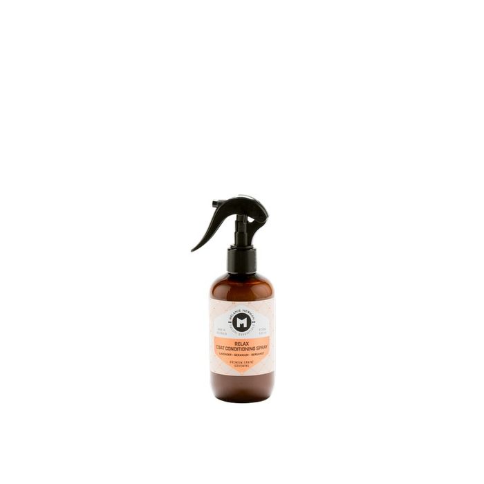 RELAX DOG COAT CONDITIONING SPRAY LAVENDERGERANIUMBERGAMOT IDEAL FOR SENSITIVE SKIN , PUPPIES AND SENIOR DOGS . BENEFITS FREE FROM HARSH SYNTHETIC CHEMICALS, MELANIE NEWMAN SALON ESSENTIALS CONDITIONING SPRAY CONTAINS VITAMIN ENRICHED MOISTURISING OILS AND ORGANIC ESSENTIAL OILS OF LAVENDER, GERANIUM AND BERGAMOT, PROVIDING NATURALLY SCENTED, TANGLE FREE, HEALTHY COAT WITH A NATURAL SHINE.