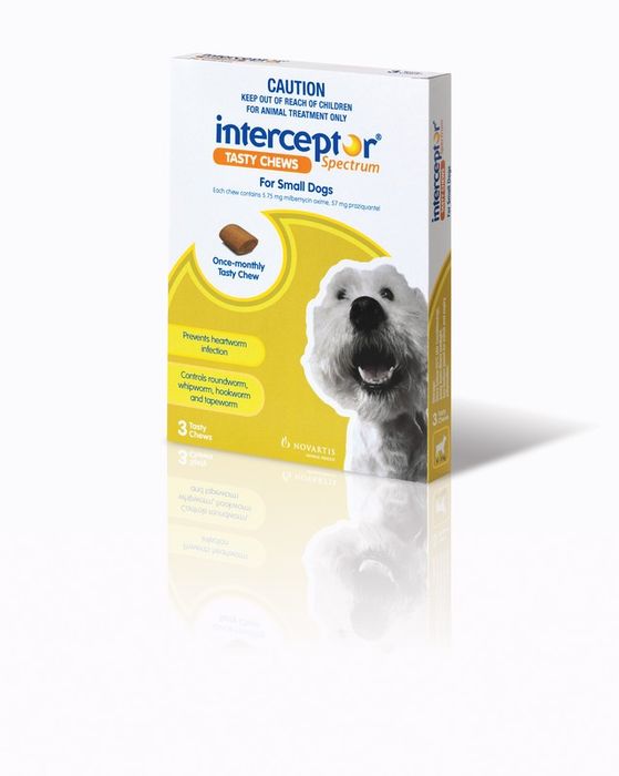 Interceptor Chews Comes In The Following Sizes, Choose The Appropiate Size For Your Dog. Interceptor Brown - For Dogs 0-4Kg (1-9Lbs) Interceptor Green - For Dogs 4-11Kg (9-22Lbs) Interceptor Yellow - For Dogs 11-22Kg (24-48 Lbs) Interceptor White - For Dogs 22-45Kg (48-100Lbs