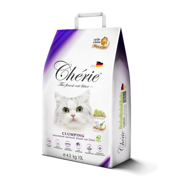 CHERIE LITTER IS NATURALLY SCENTED LIVING A FRESH LASTING SMELL WHILE THE IRREGULAR SHAPED LITTER IS DESIGNED TO CLUMP AND NOT STICK TO YOUR CATS PAWS WHICH REDUCES TRACKING. THESE CLUMPS CAN BE EASILY PICKED UP AND DISPOSED OF MAKING IT EXTREMELY LOW MAINTENANCE! THIS CLUMPING WOOD LITTER IS 100% NATURAL AND BIODEGRADABLE MEANING IT CAN BE USED ON YOUR GARDEN OR COMPOST.