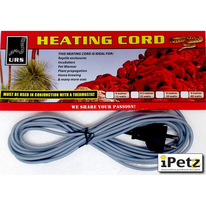 80Watt 9 Meter These Heating Cords Are Ideal For Use In Your Incubators; No More Changing Blown Globes All The Time! They Are Also A Great Heat Source For Your Reptile Enclosures; You Can Place Them Behind A False Wall Or Under A False Floor. The List Of Uses For This Heating Cord Is Endless. We Have Even Sold It To A Large Boarding Kennel To Keep The Woofers Warm. Wired To Australian Standards. Must Be Used With A Thermostat