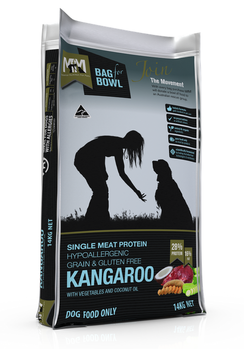 Meals For Mutts Single Protein Grain Free Kangaroo 14Kg. Single Meat Proteins Are Gaining More And More In Popularity Because They Provide A Healthy Alternative To Mixed Protein Meals. It Contains Less Calories, Less Fat And Less Cholesterol. Kangaroo Meat Is A Leaner Alternative As It Contains 28% Protein And Only 16% Fat. Ideal For Dogs With Sensitivities And Allergies, It'S Suitable For All Breeds And All Lifestages. Features:, Improves Strength As Kangaroo Meat Is Naturally The Leanest Red Meat Protein And Higher In Protein Than Beef,Omega 3 Fatty Acids And Calcium Support Good Bone Health,Naturally High Levels Of Zinc And Iron,Assists With Weight Management;All Meals For Mutts Single Protein Food Contains The Following Benefits:, Rich In Nutrition,Hypoallergenic,Gluten Free,Grain Free,Packed With Omega 3, 6 And 9,Gmo Free,High In Protein,No Preservatives,Ingredients*:Kangaroo Meat, Sweet Potato, Seasonal Vegetables, Alfalfa, Natural Fats And Oils, Omega 3, 6 & 9, Coconut Oil, Turmeric, Parsley, Probiotic, Kelp, Vitamins A, C, D3, E, K, B1, B2, B6, B12, Niacin, Pantothenic Acid, Folacin, Biotin And Natural Organic Acids, Plus Minerals, Calcium, Phosphorus, Sodium, Copper, Zinc, Iron, Manganese And Iodine. Preserved Using Vitamin E And Rosemary Extract. Feeding Guide:,Check The Manufacturer'S Feeding Guide On The Bag To Ensure You'Re Feeding The Right Amount. Daily Portion Sizes Will Depend On Your Dog'S Weight And Vary From 90G To 350G Daily.