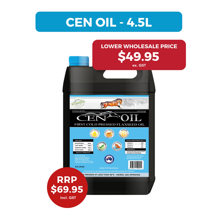 "CEN OIL 4.5L FOOD GRADE FIRST COLD PRESSED AT ROOM TEMPERATURE MAKING THIS A TRUE COLD PRESSED OIL FOOD GRADE FLAXSEED OIL FOR HORSES CONTAINING A MINIMUM OF 57-60% OMEGA 3. CEN OIL PROVIDES A HIGH-QUALITY FLAX PLANT (LINUM USITATISSIMUM) BASED SOURCE OF OMEGA 3 – AN ESSENTIAL FATTY ACID THAT MAY HELP TO; SUPPORT DIGESTIVE FUNCTION THROUGH ENHANCED ABSORPTION OF NUTRIENTS, STRENGTHEN THE IMMUNE SYSTEM, IMPROVE SKIN, COAT & JOINT HEALTH AND REDUCE IRRITATION FROM COMMON SKIN CONDITIONS. CEN OIL IS MANUFACTURED IN SMALL BATCHES USING THE HIGHEST QUALITY SEEDS, AND PRODUCED TO HUMAN FOOD GRADE STANDARDS USING NO CHEMICALS, SOLVENTS OR HEAT IN THE EXTRACTION PROCESS. FIRST PRESSED OIL IS THE TRUE COLD PRESSED OIL. OILS THAT ARE PRESSED MORE THAN ONCE ARE KNOWN AS RAW OR REFINED, THEY GO THROUGH A HEATING PROCESS UP TO 90 DEGREES CELSIUS. KEY FEATURES OF CEN FLAXSEED OIL FOR HORSES • FOOD GRADE FLAXSEED OIL FOR HORSES – STABILISED WITH NATURAL ANTIOXIDANTS & NITROGEN • CONCENTRATED OMEGA 3 SUPPLEMENT • NO SUGAR OR STARCH • NATURAL ANTI-INFLAMMATORY • MAY REDUCE INFLAMMATION OF THE JOINTS AND SKIN • IMMUNITY BOOSTER • GREAT SOURCE OF COOL CALORIES • SUITABLE FOR ULCER-PRONE HORSES • DOES NOT TRIGGER “HOT” BEHAVIOUR DUE TO THE WAY IT IS METABOLISED • APPROVED FOR ANIMAL USE (RRP $69.95 INC GST)"