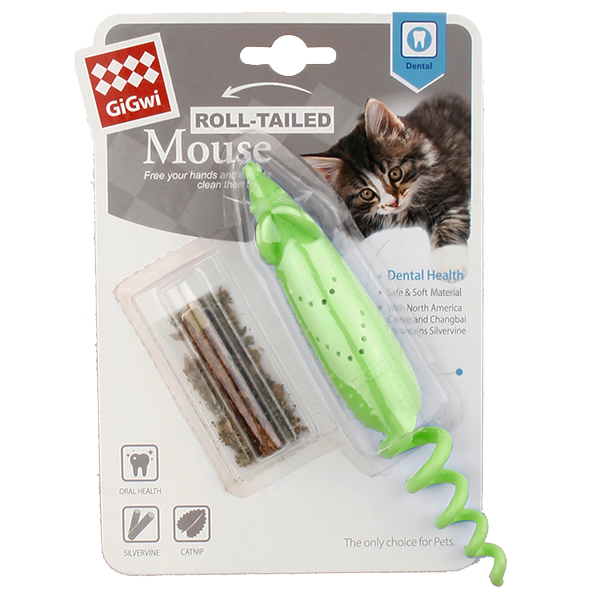 Hey, cat lovers! Say hello to your furry friend's newest obsession, the GiGwi Roll Tailed Mouse!It's no secret that cats love to play, and this toy is designed to provide hours of batting, chasing, and rolling fun. The rolling design combined with the spring tail and erratic motion of the GiGwi Roll Tailed Mouse will stimulate your cat's hunting instincts and keep them entertained for hours on end.But this toy is more than just a source of fun! The internal pocket is designed to be stuffed with catnip or your cat's favorite treat, making playtime even more delicious. Plus, the soft and flexible material is perfect for your cat to sink their teeth into, and the dental numbs on the surface help to clean your cat's teeth as they play. It's a win-win for cat and owner!This top-quality toy is brought to you by GiGwi, a trusted name in the pet industry with a reputation for creating innovative and high-quality cat toys. So you can be confident that the GiGwi Roll Tailed Mouse is a toy that your cat will love and that will keep them engaged in healthy activity.What are you waiting for? Give your feline friend the gift of non-stop fun and healthy teeth with the GiGwi Roll Tailed Mouse today!