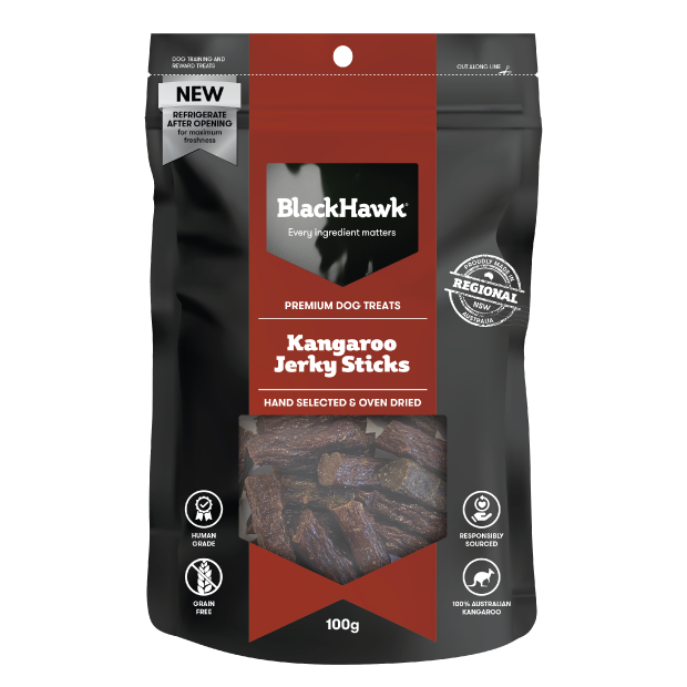 When It Comes To Your Best Friend, We Know That Every Ingredient Matters®, Even At Treat Time. Black Hawk’S New Premium Jerky Treats Have Been Crafted With The Health And Vitality Of Your Dog At Heart. Made From Responsibly Sourced, Human-Grade Local Ingredients In Regional Australia, They Deliver Nature’S Goodness From The Paddock To Your Best Friend. Fresh From The Farm, Prime Meats Are Hand-Selected, Cut And Slowly Oven-Dried To Lock In Nutrients And Flavour, So You Can Feel Confident You’Re Giving Your Dog A Tasty Treat That’S Packed With Nature’S Goodness. From The Paddock To Your Best Friend.·Made In Regional Australia· From Human-Grade Prime Cuts Of Meats·100% Responsibly Sourced Kangaroo ·Grain Free Just Like Premium Jerky For Humans, Black Hawk Jerky Treats For Dogs, Once Opened, Need To Be Stored In The Refrigerator To Maintain Quality, Taste And Freshness And Consumed Within Ten Days.Black Hawk Kangaroo Jerky Sticks Are Approximately 40Mm Long And 8-10Mm Thick. The Result Is A High Quality Treat Ideal For Small To Medium Dogs Over 12 Months Of Age.