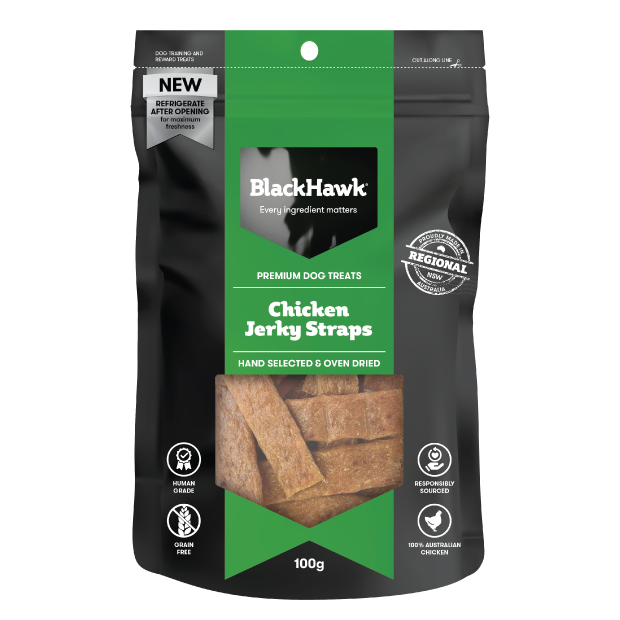 When It Comes To Your Best Friend, We Know That Every Ingredient Matters®, Even At Treat Time. Black Hawk’S New Premium Jerky Treats Have Been Crafted With The Health And Vitality Of Your Dog At Heart. Made From Responsibly Sourced, Human-Grade Local Ingredients In Regional Australia, They Deliver Nature’S Goodness From The Paddock To Your Best Friend. Fresh From The Farm, Prime Meats Are Hand-Selected, Cut And Slowly Oven-Dried To Lock In Nutrients And Flavour, So You Can Feel Confident You’Re Giving Your Dog A Tasty Treat That’S Packed With Nature’S Goodness. From The Paddock To Your Best Friend.·Made In Regional Australia·From Human-Grade Prime Cuts Of Meats·100% Australian Chicken·Responsibly Sourced ·Grain Free Just Like Premium Jerky For Humans, Black Hawk Jerky Treats For Dogs, Once Opened, Need To Be Stored In The Refrigerator To Maintain Quality, Taste And Freshness And Consumed Within Ten Days.Black Hawk Chicken Jerky Straps Are Approximately 80Mm Long And 15Mm Wide. The Result Is A High Quality Treat Ideal For Medium To Large Dogs Over 12 Months Of Age.