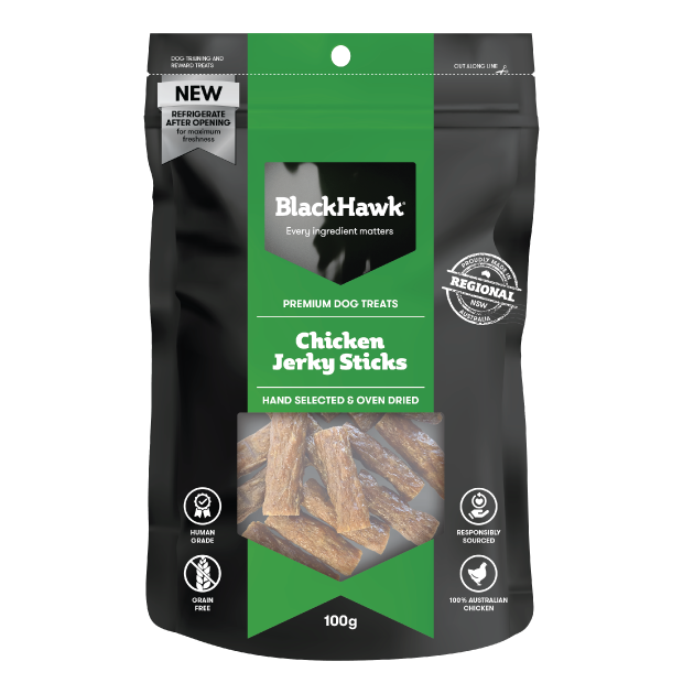 When It Comes To Your Best Friend, We Know That Every Ingredient Matters®, Even At Treat Time. Black Hawk’S New Premium Jerky Treats Have Been Crafted With The Health And Vitality Of Your Dog At Heart. Made From Responsibly Sourced, Human-Grade Local Ingredients In Regional Australia, They Deliver Nature’S Goodness From The Paddock To Your Best Friend. Fresh From The Farm, Prime Meats Are Hand-Selected, Cut And Slowly Oven-Dried To Lock In Nutrients And Flavour, So You Can Feel Confident You’Re Giving Your Dog A Tasty Treat That’S Packed With Nature’S Goodness. From The Paddock To Your Best Friend.·Made In Regional Australia·From Human-Grade Prime Cuts Of Meats·100% Australian Chicken·Responsibly Sourced ·Grain Free Just Like Premium Jerky For Humans, Black Hawk Jerky Treats For Dogs, Once Opened, Need To Be Stored In The Refrigerator To Maintain Quality, Taste And Freshness And Consumed Within Ten Days.Black Hawk Chicken Jerky Sticks Are Approximately 40Mm Long And 8-10Mm Thick. The Result Is A High Quality Treat Ideal For Small To Medium Dogs Over 12 Months Of Age.