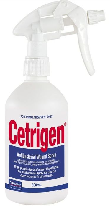 Cetrigen Antibacterial Wound Spray Cetrigen is a unique formula to treat cuts and superficial wounds in all animals. This product contains an antibacterial agent, insect repellent and an added feature of purple dye to indicate coverage of the intended site. The Properties of Cetrigen assists in providing protection to minor wounds left after surgical procedures. Containing an antiseptic to protect wounds from infection Cetrigen is practically a first aid kit in a bottle formulated to treat cuts, scrapes and many other minor injuries.