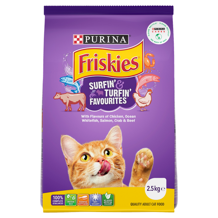 FRISKIES Surfin' & Turfin'® is the best of land and sea together in one bag, with enticing aromas and appealing shapes, including chicken, beef, ocean whitefish, crab and salmon. It’s more than just a delicious meal, it’s a sensory journey filled with wonder and delight. Unlock a world of sensory delight for your cat by feeding them FRISKIES Dry Cat Food.FRISKIES Dry Cat Food is 100% Complete and Balanced providing all the nutritional goodness your cat needs to live life to the fullest.