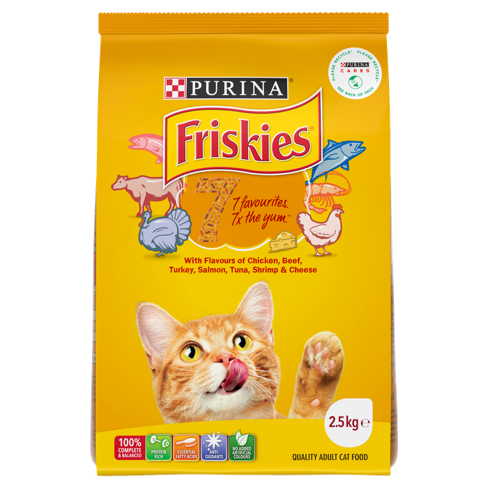FRISKIES 7® is made up of kibble biscuits in a variety of meat and seafood shapes with the flavours of chicken, beef, turkey, salmon, tuna, shrimp and cheese. 7 of your cats favourite flavours for 7 x the yum it will bowl your cat over.FRISKIES Dry Cat Food is 100% Complete and Balanced providing all the nutritional goodness your cat needs to live life to the fullest.
